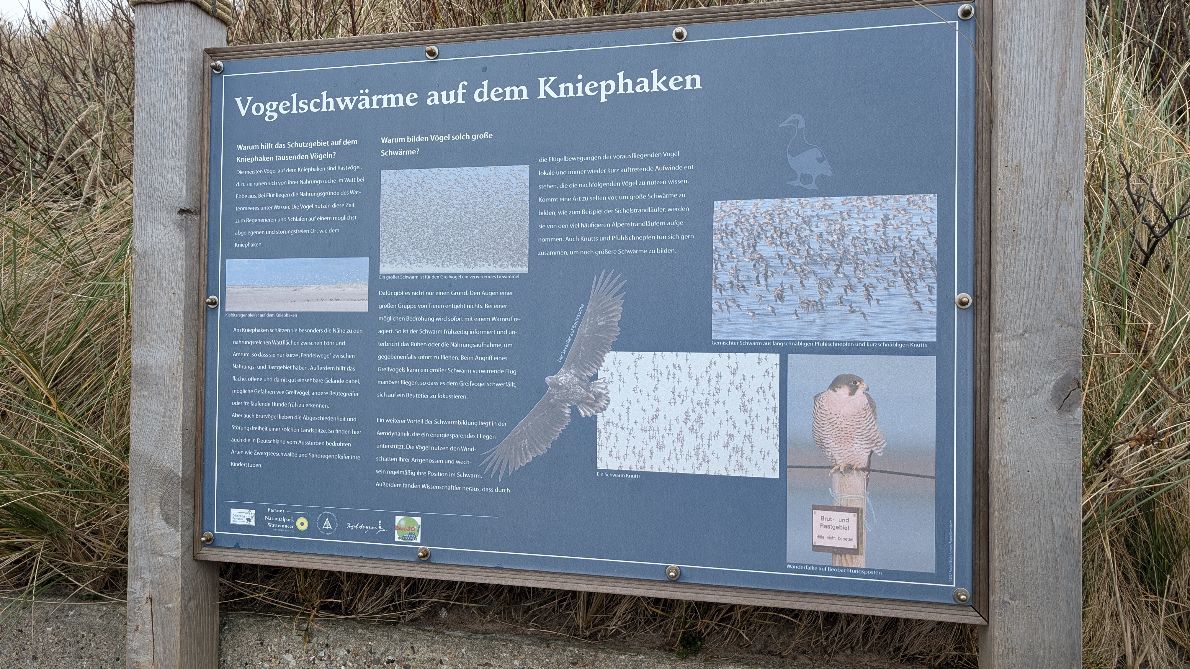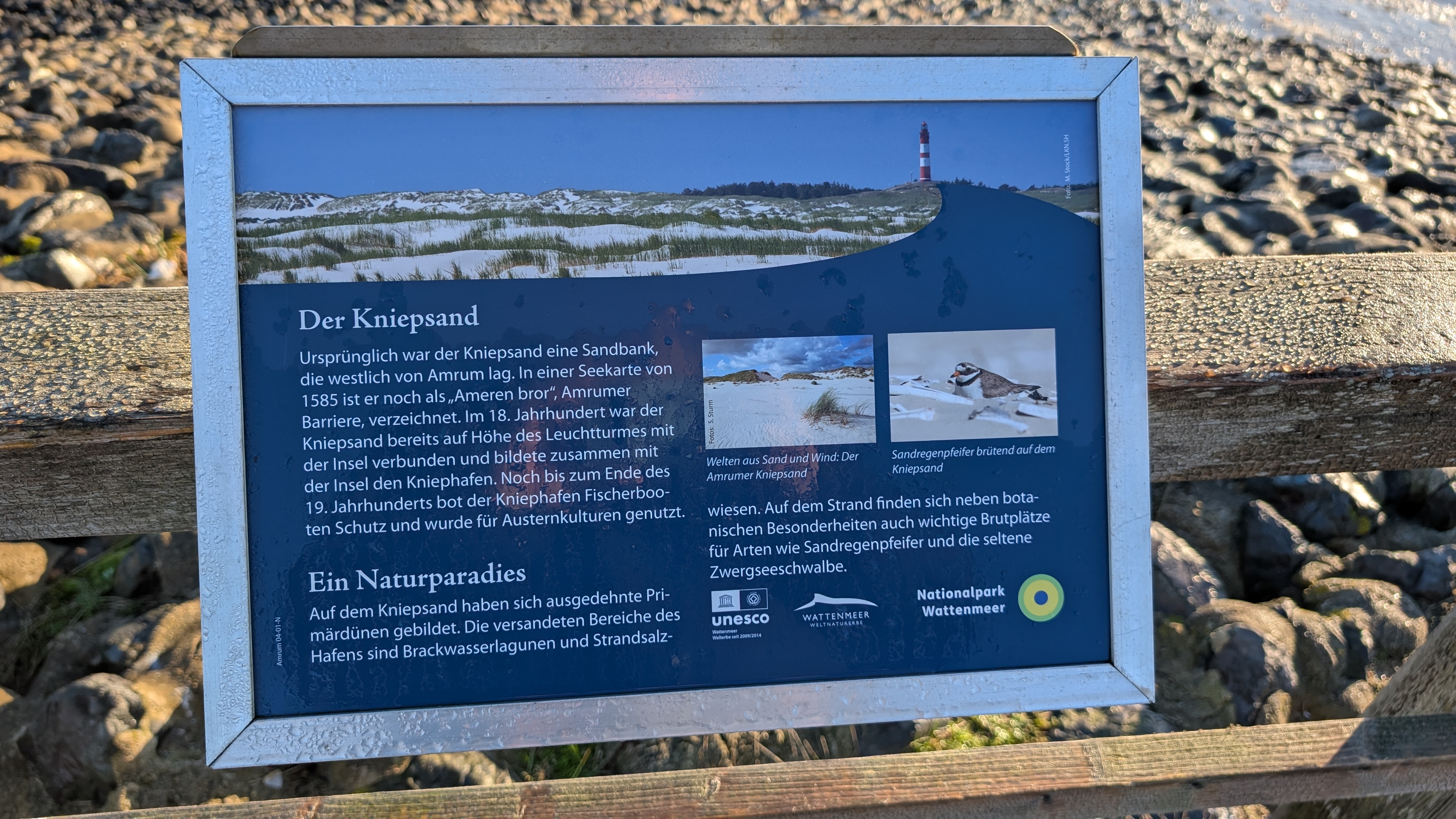 Ich werde manchmal gefragt, was eigentlich der "Kniepsand" ist - hier gibt es eine schöne Infotafel, die den Begriff erklärt. Wer bei Google-Maps nachschauen mag, wird auf der Westseite von Amrum einen breiten Strand sehen. Das ist die angelagerte Sandbank, der "Kniepsand". Südlich bildet der Kniepsand einen Haken - der heißt dann auch Kniepsandhaken und ist Heimat für zahllose, sehr seltene Vogelarten. Im Frühjahr gibt es dort eine kleine Absperrung, die den unteren Teil des Kniepsandhakens schützen soll.